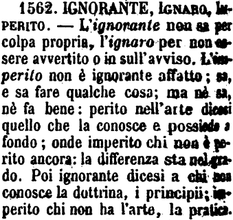 | Ignorante, Ignaro, Imperito - L'ignorante non sa per colpa propria, l'ignaro per non essere avvertito o in sull'avviso. L'imperito non è ignorante affatto; sa, e sa fare qualche cosa; ma nè sa, nè fa bene: perito nell'arte dicesi quello che la conosce e possiede a fondo; onde imperito chi non è perito ancora: la differenza sta nel grado. Poi ignorante dicesi a chi non conosce la dottrina, i principii; imperito chi non ha l'arte, la pratica. [immagine] |