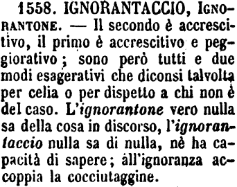 | Ignorantaccio, Ignorantone - Il secondo è accrescitivo, il primo è accrescitivo e peggiorativo; sono però tutti e due modi esagerativi che diconsi talvolta per celia o per dispetto a chi non è del caso. L'ignorantone vero nulla sa della cosa in discorso, l'ignorantaccio nulla sa di nulla, nè ha capacità di sapere; all'ignoranza accoppia la cocciutaggine. [immagine] |