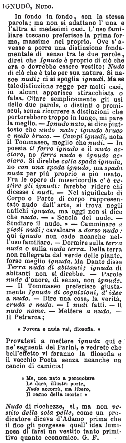 | Ignudo, Nudo - In fondo in fondo, son la stessa parola; ma non si adattano l'una e l'altra ai medesimi casi. L'uso familiare toscano preferisce la prima forma, massime nel proprio. Ove s'avesse a porre una distinzione fondamentale di senso tra le due parole, direi che Ignudo è proprio di ciò che era o dovrebbe essere vestito; Nudo di ciò che è tale per sua natura. Si nasce nudi; ci si spoglia ignudi. Ma se tale distinzione regge per molti casi, in alcuni apparisce stiracchiata o falsa. Citare semplicemente gli usi delle due parole, o distinti o promiscui, senza ricorrere a distinzioni che porterebbero troppo in lungo, mi pare la meglio. - Ignudo nato, si dice piuttosto che nudo nato; ignudo bruco e nudo bruco. - Campi ignudi, nota il Tommaseo, meglio che nudi. - In poesia il ferro ignudo e il nudo acciaro no ferro nudo e ignudo acciaro. Si direbbe colla spada ignuda, no con una spada ignuda. ma spada nuda par più proprio e più usato. Fra le opere di misericordia c'è vestire gli ignudi: farebbe ridere chi dicesse i nudi. - Nel significato di Corpo o Parte di corpo rappresentato nudo dall'arte, si trova negli antichi ignudo, ma oggi non si dice che nudo. - «Scuola del nudo. - Studiare il nudo.» - Camminare a piedi nudi, cavalcare a dorso nudo: qui ignudo non cade neanche nell'uso familiare. - Dormire sulla terra nuda o sulla nuda terra. Della terra non rallegrata dal verde delle piante, forse meglio ignuda. Ma Dante disse Terra nuda di abitanti; ignuda di abitanti non si direbbe. - Parole nude d'onore, di senso, non ignude. - Il Tommaseo preferisce giustamente Ignudo di cognizioni, d'idee a nudo. - Dire una cosa, la verità, cruda e nuda. - I nudi fatti. - Il nudo nome. - Mettere a nudo. - Il Petrarca;