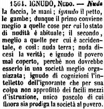 | Ignudo, Nudo - Nuda la faccia, le mani; ignudo il petto, le gambe; dunque il primo conviene meglio a quelle cose per cui lo stato di nudità è abituale; il secondo, meglio a quelle per cui è accidentale, e così: nuda terra; nuda dicesi la verità; e ignudo il povero mal coperto, perché non dovrebbe esserlo in una società meglio organizzata; ignudo di cognizioni l'intelletto dell'ignorante che per sua colpa non approfittò dei facili mezzi d'istruzione, unico pascolo di cui finora sia prodiga la società al povero. [immagine] |