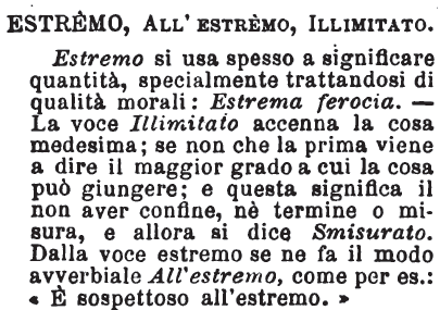 | Estremo, All’estremo, Illimitato - Estremo si usa spesso a signficare quantità, specialmente trattandosi di qualità morali: Estrema ferocia. - La voce Illimitato accenna la cosa medesima; se non che la prima viene a dire il maggior grado a cui la cosa può giungere; e questa significa il non aver confine, nè termine o misura, e allora si dice Smisurato. Dalla voce estremo se ne fa il modo avverbiale All'estremo, come per es.: «E' sospettoso all'estremo.» [immagine] |
