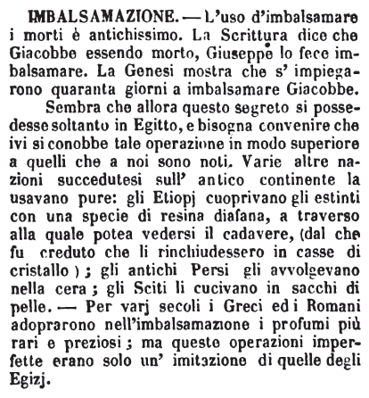| Imbalsamazione - L'uso d'imbalsamare i morti è antichissimo. La Scrittura dice che Giacobbe essendo morto, Giuseppe lo fece imbalsamare. La Genesi mostra che s'impiegarono quaranta giorni a imbalsamare Giacobbe.
