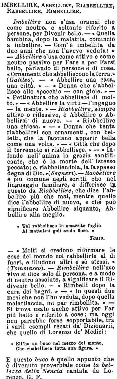 | Imbellire, Abbellire, Riabbellire, Rabbellire, Rimbellire - Imbellire non s'usa oramai che come neutro, e soltanto riferito a persone, per Divenir bello. - «Quella bambina, dopo la malattia, cominciò a imbellire. - Com'è imbellita da due anni che non l'avevo veduta!» - Abbellire s'usa come attivo e come neutro passivo per Fare e per Farsi bello, parlando di persone e di cose. «Ornamenti che abbelliscono la terra.» (Galileo). - «Abbellire una casa, una città.» - «Donna che s'abbellisce allo specchio - con gioje.» - «Pettinatura che abbellisce di molto.» - «Abbellire la virtù - l'ingegno - la mente.» - Riabbellire, sempre attivo o riflessivo, è Abbellire o Abbellirsi di nuovo. - «Riabbellire una chiesa.» - «Donna che tenta riabbellirsi con ornamenti, con belletti, che la facciano apparir bella come una volta.» - «Città che dopo il terremoto si riabbellisce.» - «Infonde nell'anima la grazia santificante, che è la morte dell'istesso peccato; e, riabbellendola, la fa spesso degna di Dio.» (Segneri). - Rabbellire è più comune negli scritti che nel linguaggio familiare, e differisce in questo da Riabbellire, che dice l'abbellire più che mai, mentre quello dice l'abbellire di nuovo, e che può significare Abbellire alquanto, Abbellire alla meglio.