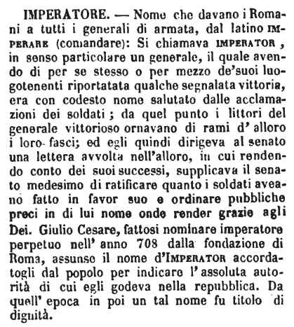 | Imperatore - Nome che davano i Romani a tutti i generali di armata, dal latino imperare (comandare): Si chiamava imperator, in senso particolare un generale, il quale avendo di per se stesso o per mezzo de' suoi luogotenenti riportata qualche segnalata vittoria, era con codesto nome salutato dalle acclamazioni dei soldati; da quel punto i littori del generale vittorioso ornavano di rami d'alloro i loro fasci; ed egli quindi dirigeva al senato una lettera avvolta nell'alloro, in cui rendendo conto dei suoi successi, supplicava il senato medesimo di ratificare quanto i soldati aveano fatto in favor suo e ordinare pubbliche preci in di lui nome onde render grazie agli Dei. Giulio Cesare, fattosi nominare imperatore perpetuo nell'anno 708 dalla fondazione di Roma, assunse il nome d'Imperator accordatogli dal popolo per indicare l'assoluta autorità di cui egli godeva nella repubblica. Da quell'epoca in poi un tal nome fu titolo di dignità. [immagine] |