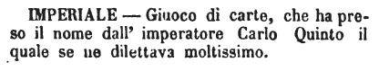 | Imperiale - Giuoco di carte, che ha preso il nome dall'imperatore Carlo Quinto il quale se ne dilettava moltissimo. [immagine] |