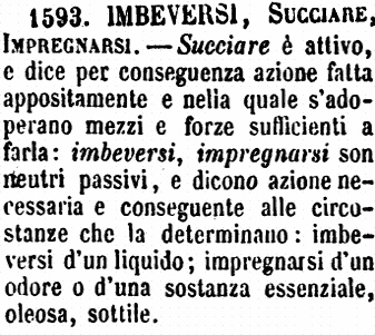 | Imbeversi, Succiare, Impregnarsi - Succiare è attivo, e dice per conseguenza azione fatta appositamente e nella quale s'adoperano mezzi e forze sufficienti a farla: imbeversi, impregnarsi son neutri passivi, e dicono azione necessaria e conseguente alle circostanze che la determinano: imbeversi d'un liquido; impregnarsi d'un odore o d'una sostanza essenziale, oleosa, sottile. [immagine] |