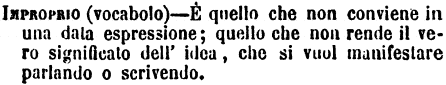 | Improprio (vocabolo) - È quello che non conviene in una data espressione; quello che non rende il vero significato dell'idea, che si vuol manifestare parlando o scrivendo. [immagine] |