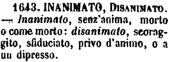 | Inanimato, Disanimato - Inanimato, senz'anima, morto o come morto: disanimato, scoraggito, sfiduciato, privo d'animo, o a un dipresso. [immagine] |