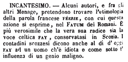 | Incantesimo - Alcuni autori, e fra gli altri Menage, pretendono trovare l'etimologia della parola francese féerie, con cui questa azione si esprime, nel Fatum dei Romani. E' più verosimile che la vera sua radice sia la voce celtica fay, conservatasi in Scozia. I contadini scozzesi dicono anche al dì d'oggi fay ad un uomo ch'è idiota e come sotto l'influenza di un genio maligno. [immagine] |