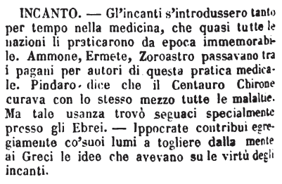 | Incanto - Gl'incanti s'introdussero tanto per tempo nella medicina, che quasi tutte le nazioni li praticarono da epoca immemorabile. Ammone, Ermete, Zoroastro passavano tra i pagani per autori di questa pratica medicale. Pindaro dice che il Centauro Chirone curava con lo stesso mezzo tutte le malattie. Ma tale usanza trovò seguaci specialmente presso gli Ebrei. - Ippocrate contribuì egregiamente co'suoi lumi a togliere dalla mente ai Greci le idee che avevano su le virtù degli incanti. [immagine] |