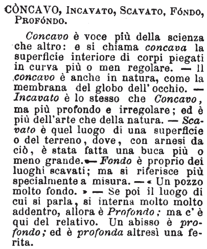 | Concavo, Incavato, Scavato, Fondo, Profondo - Concavo è voce più della scienza che altro: e si chiama concava la superficie interiore di corpi piegati in curva più o men regolare. - Il concavo è anche in natura, come la membrana del globo dell'occhio. - Incavato è lo stesso che Concavo, ma più profondo e irregolare; ed è più dell'arte che della natura. - Scavato è quel luogo di una superficie o del terreno, dove, con arnesi da ciò, è stata fatta una buca più o meno grande. - Fondo è proprio dei luoghi scavati; ma si riferisce più specialmente a misura. - «Un pozzo molto fondo.» - Se poi il luogo di cui si parla, si interna molto molto addentro, allora è Profondo; ma c'è qui del relativo. Un abisso è profondo; ed è profonda altresì una ferita. [immagine] |