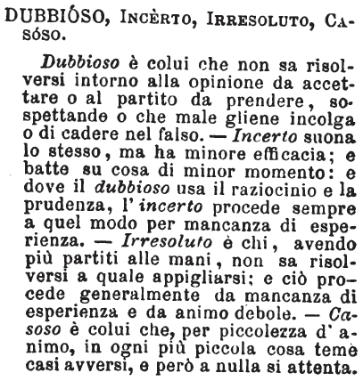 | Incerto, Dubbio - Incerto suol dirsi per rispetto alla credibilità e all'evento: la cosa incerta è quella che non dà ragioni sufficienti da crederla vera. - Dubbiosa è quella che non dà ragioni sufficienti da risolversi a farla. Vedute tali differenze, è facile coglier quelle che passano tra la persona incerta e la dubbiosa. [immagine] |