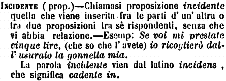 | Incidente (prop.) - Chiamasi proposizione incidente quella che viene inserita fra le parti d'un'altra o tra due proposizioni tra sè rispondenti, senza che vi abbia relazione. - Esemp: Se voi mi prestate cinque lire, (che so che l'avete) io ricoglierò dall'usuraio la gonnella mia.