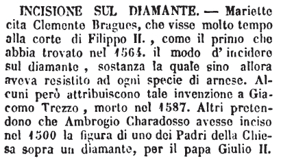 | Incisione sul diamante - Mariette cita Clemente Bragues, che visse molto tempo alla corte di Filippo II., come il primo che abbia trovato nel 1564. il modo d'incidere sul diamante, sostanza la quale sino allora aveva resistito ad ogni specie di arnese. Alcuni però attribuiscono tale invenzione a Giacomo Trezzo, morto nel 1587. Altri pretendono che Ambrogio Charadosso avesse inciso nel 1500 la figura di uno dei Padri della Chiesa sopra un diamante, per il papa Giulio II. [immagine] |
