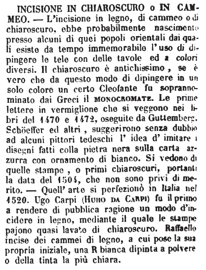 | Incisione in colore - a imitazione della pittura. Si deve questa scoperta a Giacomo Cristofano Le Blond di Francoforte, allievo di Carlo Maratti. Il suo metodo era d'imprimere le stampe con tre tavole preparate, ed impiegare a tal'effetto tre colori che chiamava primitivi, cioè giallo, rosso, e turchino. L'epoca di codesta invenzione può collocarsi fra il 1720 e 1730. [immagine] |