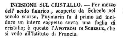 | Incisione sul cristallo - Per mezzo dell'acido fluorico, scoperto da Scheele nel secolo scorso, Puymarin fu il primo ad incidere un intero soggetto sovra una foglia di cristallo; è questo l'apoteosi di scheele, che si vede all'Istituto di Francia. [immagine] |