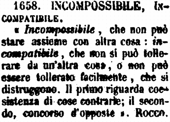| Incompossibile, Incompatibile - «Incompossibile, che non può stare assieme con altra cosa: incompatibile, che non si può tollerare da un'altra cosa, o non può essere tollerato facilmente, che si distruggono. Il primo riguarda coesistenza di cose contrarie; il secondo, concorso d'opposte». Rocco. [immagine] |