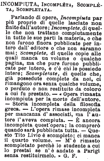 | Incompiuta, Incompleta, Scompleta, Scompletata - Parlando di opere, Incompiuta par più proprio di quelle lasciate non finite dall'autore; Incomplete, di quelle che non trattano compiutamente in tutte le sue parti la materia, o che non furono finora pubblicate per intero dall'editore o che non saranno mai; Scomplete, di quelle copie alle quali manca un volume o qualche pagina, ma che pure furono pubblicate per intero, e c'è chi le possiede intere; Scompletate, di quelle che, già possedute complete da noi, ci rimangono ora senza qualche volume, o perduto o non restituito da coloro a cui fu prestato. -«Opera rimasta incompiuta per la morte dell'autore. - Storia incompleta della filosofia greca. - L'opera rimase incompleta per mancanza d'associati, ma l'autore l'aveva compiuta. - E' ancora incompleta quest'opera; la comprerò quando sarà pubblicata tutta. - Questo Tito Livio è scompleto; ci manca il quarto volume. - M'è rimasto scompletato perchè lo studente a cui lo prestai se n'è andato a Parigi senza restituirmelo.» G.F. [immagine] |