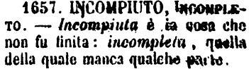 | Incompiuto, Incompleto - Incompiuta è la cosa che non fu finita: incompleta, quella della quale manca qualche parte. [immagine] |