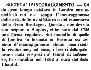 | Società d’incoraggiamento - Già da gran tempo esisteva in Londra una società di cui era scopo l'incoraggimento delle arti, delle manifatture e del commercio della Gran Brettagna. Questa, che deve la sua origine a Shipley, ebbe sino dal 1756 una forma regolare. Sul modello di quella di Londra fu formata in Francia una società d'incoraggimento alcuni anni avanti la rivoluzione; ed essa, i lavori della quale erano stati sospesi ne' tempi di turbolenze, fu ristabilita nel 1802 a cura del dotto Chaptal. [immagine] |