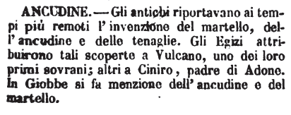 | Ancudine - Gli antichi riportavano ai tempi più remoti l'invenzione del martello, dell'ancudine e delle tenaglie. Gli Egizi attribuirono tali scoperte a Vulcano, uno dei loro primi sovrani; altri a Ciniro, padre di Adone. In Giobbe si fa menzione dell'ancudine e del martello. [immagine] |