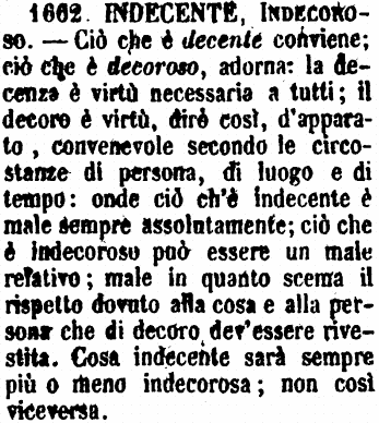 | Indecente, Indecoroso - Ciò che è Decente, conviene. Ciò che è Decoroso, adorna: la Decenza è virtù necessaria a tutti; il Decoro è virtù, dirò così, d'apparato, convenevole secondo le circostanze di persona, di luogo e di tempo: onde ciò ch'è indecente, è male sempre assolutamente; ciò che è indecoroso può essere un male relativo; male in quanto scema il rispetto dovuto alla cosa e alla persona che di decoro dev'essere rivestita. Cosa indecente sarà sempre più o meno indecorosa; non così viceversa. [immagine] |