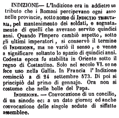 Indizione - L'Indizione era in addietro un tributo che i Romani percipevano ogni anno nelle provincie, sotto il nome di Indictio tributaria, pel mantenimento dei soldati, e segnatamente di quelli che avevano servito quindici anni. Quando l'Impero cambiò aspetto, sotto gli ultimi imperatori, si conservò il termine di Indizione, ma ne variò il senso, e venne a significare soltanto lo spazio di quindici anni. Codesta epoca fu stabilita in Oriente sotto il regno di Costantino. Solo nel secolo VI. se ne fece uso nella Gallia. In Francia l'Indizione cominciò a di 24 settembre 573. Di poi si principiò dal primo di gennajo. Ora non si costume che nelle bolle del Papa.