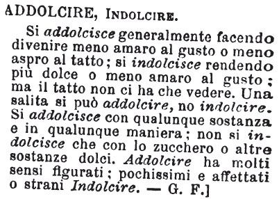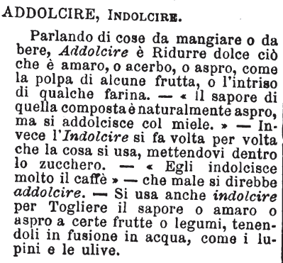 | Addolcire, Indolcire - Si addolcisce generalmente facendo divenire meno amaro al gusto o meno aspro al tatto; si indolcisce rendendo più dolce o meno amaro al gusto; ma il tatto non ci ha che vedere. Una salita si può addolcire, no indolcire. Si addolcisce con qualunque sostanza e in qualunque maniera; non si indolcisce che con lo zucchero o altre sostanze dolci. Addolcire ha molti sensi figurati; pochissimi e affettati o strani Indolcire. - G. F.] [immagine] |