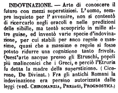 | Indovinazione - e † INDIVINAZIONE. [T.] S. f. Azione attuale e abituale, Superstizione, e Arte dell'indovinare. V. anche DIVINAZIONE. Divinatio, aureo lat. [Camp.] Bib. Jer. 14. Eglino profetano a voi visioni di bugie e indovinazioni d'inganno (divinationem). Ces. Com. Le donne,… con certe sorti e indivinazioni, declaravano se era utile la battaglia (vaticinationibus). = Maestruzz. 2. 14. (C) Riducesi alla indivinazione per le stelle, ovvero ancora a sorte. S. Agost. C. D. Non con augurio, ma (forse Nè) con indovinazione, nè con sogno d'alcuno pronunziavano esser cosa trista. Cavalc. Pungil. cap. 29. (Man.) [Val.] Lanc. Eneid. 7. 315. = Plut. Adr. Op. mor. 4. 77. (Man.)