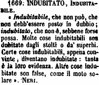 | Indubitato, Indubitabile - «Indubitabile, che non può, che non debb'essere posto in dubbio; indubitato, che non è, sebbene forse possa. Molte cose indubitabili son dubitate dagli stolti o da' superbi. Certe cose indubitabili, appena convinte, diventano indubitate: tanta è la lora evidenza. Altre cose indubitate son false, come il moto solare». Neri. [immagine] |