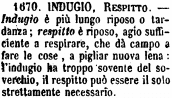 | Indugio, Respitto - Indugio è più lungo riposo o tardanza; respitto è riposo, agio sufficiente a respirare, che dà campo a fare le cose, a pigliar nuova lena: l'indugio ha troppo sovente del soverchio, il respitto può essere il solo strettamente necessario. [immagine] |