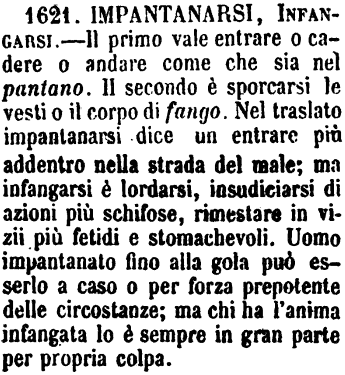 | Impantanarsi, Infangarsi - Il primo vale entrare o cadere o andare come che sia nel pantano. Il secondo è sporcarsi le vesti o il corpo di fango. Nel traslato impantanarsi dice un entrare più addentro nella strada del male; ma infangarsi è lordarsi, insudiciarsi di azioni più schifose, rimestare in vizii più fetidi e stomachevoli. Uomo impantanato fino alla gola può esserlo a caso o per forza prepotente delle circostanze; ma chi ha l'anima infangata lo è sempre in gran parte per propria colpa. [immagine] |