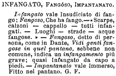 | Infangato, Fangoso, Impantanato - Infangato vale Insudiciato di fango; Fangoso, Che ha fango. - «Scarpe, calzoni - cappello - tutti infangati. - Luoghi - strade - acque fangose.» - Fangoso, detto di persona, come in Dante, Vidi genti fangose in quel pantano. sebbene non comune, indica un infangamento più grave; quasi Infangato da capo a piedi. - Impantanato vale immerso, Fitto nel pantano. G. F. [immagine] |
