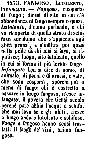 | Fangoso, Lutolento, Infangato - Fangoso, ricoperto di fango; dicesi di sito in cui c'è abbondanza di fango sempre o quasi. Lutolento, d'uomo parlando, è chi va ricoperto di quello strato di schifoso sucidume che s'appiccica agli abiti prima, e s'infiltra poi quasi nella pelle di chi mai si lava, si ripulisce; luogo, sito lutolento, quello in cui si forma il più lurido fango. Infangato ben si dice di uomo, di animale, di panni e di arnesi, e vale, che sono cospersi, sporchi più o meno di fango: chi è costretto a passare in luogo fangoso, n'esce infangato; il povero che tiensi sucido perchè pare abbia l'acqua a schifo, che mai lava sè e gli abiti, riesce a lungo andare lutolento e schifoso. Fango e fangoso hanno sensi traslati: il fango de' vizii, animo fangoso. [immagine] |