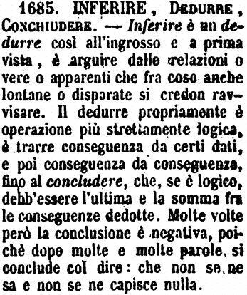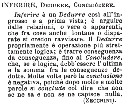 | Inferire, Dedurre, Conchiudere - Inferire è un Dedurre così all'ingrosso e a prima vista; è arguire dalle relazioni, o vere o apparenti, che fra cose anche lontane o disparate si credon ravvisare. Il Dedurre propriamente è operazione più strettamente logica; è trarre conseguenza da conseguenza, fino al Concludere, che, se è logica, debb'essere l'ultima e la somma fra le conseguenze dedotte. Molte volte però la conclusione è negativa, poichè dopo molte e molte parole si conclude col dire che non se ne sa e non se ne capisce nulla. (Zecchini). [immagine] |