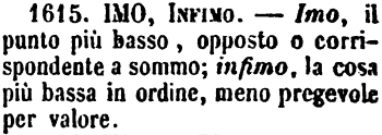 | Imo, Infimo - Imo, il punto più basso, opposto o corrispondente a sommo; infimo, la cosa più bassa in ordine, meno pregevole per valore. [immagine] |