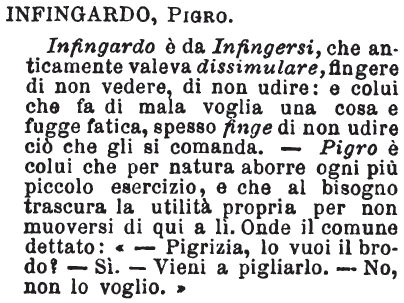| Infingardo, Pigro - Infingardo è da Infingersi, che anticamente valeva dissimulare, fingere di non vedere, di non udire: e colui che fa di mala voglia una cosa e fugge fatica, spesso finge di non udire ciò che gli si comanda. - Pigro è colui che per natura aborre ogni più piccolo esercizio, e che al bisogno trascura la utilità propria per non muoversi di qui a lì. Onde il comune dettato: « - Pigrizia, lo vuoi il brodo? - Sì. - Vieni a pigliarlo. - No, non lo voglio.» [immagine] |