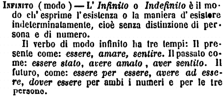 | Infinito (modo) - L'Infinito o Indefinito è il modo ch'esprime l'esistenza o la maniera d'esistere indeterminatamente, cioè senza distinzione di persona e di numero.