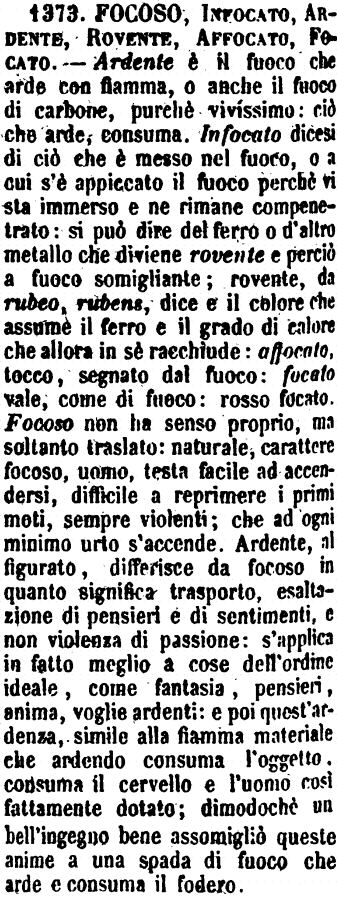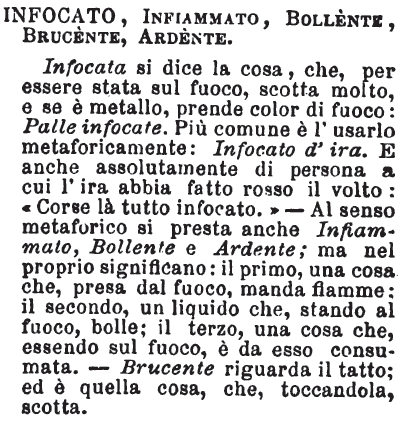 | Infocato, Infiammato, Bollente, Brucente, Ardente - Infocata si dice la cosa, che, per essere stata sul fuoco, scotta molto, e se è metallo, prende color di fuoco: Palle infocate. Più comune è l'usarlo metaforicamente: Infocato d'ira. E anche assolutamente di persona a cui l'ira abbia fatto rosso il volto: «Corse là tutto infocato.» - Al senso metaforico si presta anche Infiammato, Bollente e Ardente; ma nel proprio significato: il primo, una cosa che, presa dal fuoco, manda fiamme: il secondo, un liquido che, stando al fuoco, bolle; il terzo, una cosa che, essendo sul fuoco, è da esso consumata. - Brucente riguarda il tatto; ed è quella cosa, che, toccandola, scotta. [immagine] |