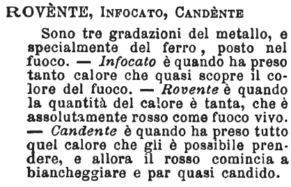 | Rovente, Infocato, Candente - Sono tre gradazioni del metallo, e specialmente del ferro, posto nel fuoco. - Infocato è quando ha preso tanto calore che quasi scopre il colore del fuoco. - Rovente è quando la quantità del calore è tanta, che è assolutamente rosso come fuoco vivo. - Candente è quando ha preso tutto quel calore che gli è possibile prendere, e allora il rosso comincia a biancheggiare e par quasi candido. [immagine] |