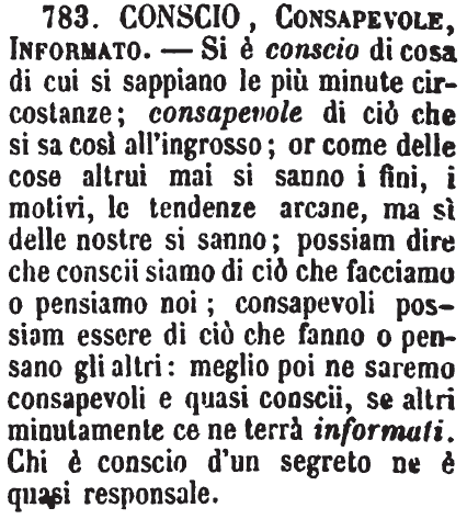 | Conscio, Consapevole, Informato - Si è conscio di cosa di cui si sappiano le più minute circostanze; consapevole di ciò che si sa così all'ingrosso; or come delle cose altrui mai si sanno i fini, i motivi, le tendenze arcane, ma sì delle nostre si sanno; possiam dire che conscii siamo di ciò che facciamo o pensiamo noi; consapevoli possiam essere di ciò che fanno o pensano gli altri: meglio poi ne saremo consapevoli e quasi conscii, se altri minutamente ce ne terrà informati. Chi è conscio d'un segreto ne è quasi responsale. [immagine] |
