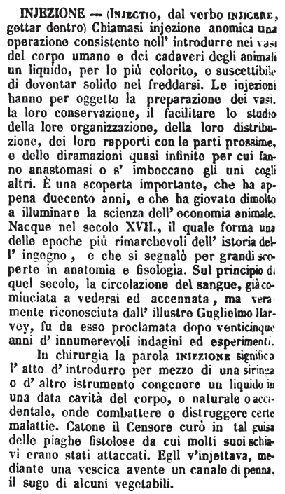 | Injezione - (Injectio, dal verbo injicere, gettar dentro) Chiamasi injezione anomica una operazione consistente nell'introdurre nei vasi del corpo umano e dei cadaveri degli animali un liquido, per lo più colorito, e suscettibile di doventar solido nel freddarsi. Le injezioni hanno per oggetto la preparazione dei vasi, la loro conservazione, il facilitare lo studio della loro organizzazione, della loro distribuzione, dei loro rapporti con le parti prossime, e delle diramazioni quasi infinite per cui fanno anastomasi o s'imboccano gli uni cogli altri. E' una scoperta importante, che ha appena duecento anni, e che ha giovato dimolto a illuminare la scienza dell'economia animale. Nacque nel secolo XVII., il quale forma una delle epoche più rimarchevoli dell'istoria dell'ingegno, e che si segnalò per grandi scoperte in anatomia e fisologia. Sul principio di quel secolo, la circolazione del sangue, già cominciata a vedersi ed accennata, ma veramente riconosciuta dall'illustre Guglielmo Harvey, fu da esso proclamata dopo venticinque anni d'innumerevoli indagini ed esperimenti.