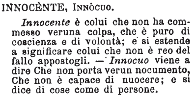 | Innocente, Innocuo - Innocente è colui che non ha commesso veruna colpa, che è puro di coscienza e di volontà; e si estende a significare colui che non è reo del fallo apostogli. Innoquo viene a dire Che non porta verun nocumento, Che non è capace di nuocere; e si dice di cose come di persone. [immagine] |