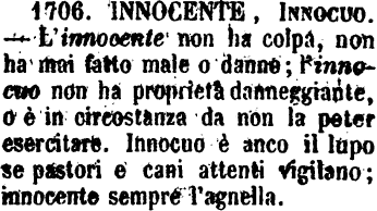 | Innocente, Innocuo - L'innocente non ha colpa, non ha mai fatto male o danno; l'innocuo non ha proprietà danneggiante, o è in circostanza da non la poter esercitare. Innocuo è anco il lupo se pastori e cani attenti vigilano; innocente sempre l'agnella. [immagine] |
