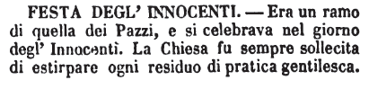 | Festa degl’innocenti - Era un ramo di quella dei Pazzi, e si celebrava nel giorno degl'Innocentì. La Chiesa fu sempre sollecita di estirpare ogni residuo di pratica gentilesca. [immagine] |