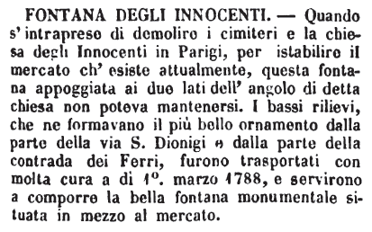 | Fontana degli innocenti - Quando s'intraprese di demolire i cimiteri e la chiesa degli Innocenti in Parigi, per istabilire il mercato ch'esiste attualmente, questa fontana appoggiata ai due lati dell'angolo di detta chiesa non poteva mantenersi. I bassi rilievi, che ne formavano il più bello ornamento dalla parte della via S.Dionigi e dalla parte della contrada dei Ferri, furono trasportati con molta cura a di 1°. marzo 1788, e servirono a comporre la bella fontana monumentale situata in mezzo al mercato. [immagine] |