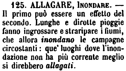 | Allagare, Inondare - Il primo può essere un effetto del secondo. Lunghe e dirotte pioggie fanno ingrossare e straripare i fiumi, che allora inondano le campagne circostanti: que' luoghi dove l'inondazione non ha più corrente meglio si direbbero allagati. [immagine] |
