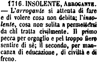 | Arrogante, Tracotante, Insolente - Arrogante è chi pretende e chiede per sè più che non merita. Tracotante è chi crede sè valere molto più degli altri, e lo dimostra colla superbia o durezza degli atti. Insolente è chi perde il rispetto, è chi non tratta come suole (insolito modo) onesta e ben educata persona. L'arrogante è un superbo, il tracotante è un prepotente, l'insolente, un malcreato e un villano. [immagine] |