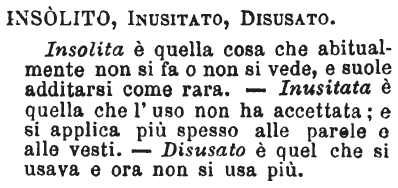| Insolito, Inusitato, Disusato - Insolita è quella cosa che abitualmente non si fa o non si vede, e suole additarsi come rara. - Inusitata è quella che l'uso non ha accettata; e si applica più spesso alle parole e alle vesti. - Disusato è quel che si usava e ora non si usa più. [immagine] |