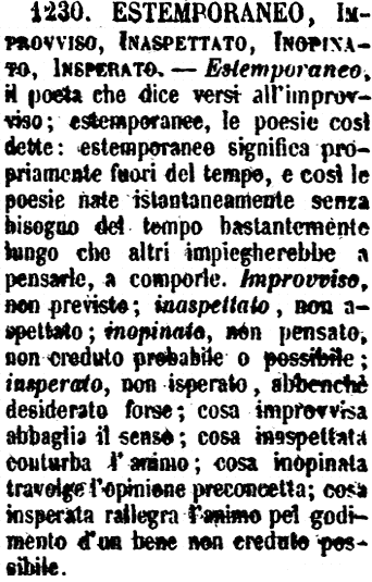 | Estemporaneo, Improvviso, Inaspettato, Inopinato, Insperato - Estemporaneo, il poeta che dice versi all'improvviso; estemporanee, le poesie così dette: estemporaneo significa propriamente fuori del tempo, e così le poesie nate istantaneamente senza bisogno del tempo bastantemente lungo che altri impiegherebbe a pensarle, a comporle. Improvviso, non previsto; inaspettato non aspettato; inopinato, non pensato, non creduto probabile o possibile; insperato, non isperato, abbenchè desiderato forse; cosa improvvisa abbaglia il senso; cosa inaspettata conturba l'animo; cosa inopinata travolge l'opinione preconcetta; cosa insperata rallegra l'animo pel godimento d'un bene non creduto possibile. [immagine] |